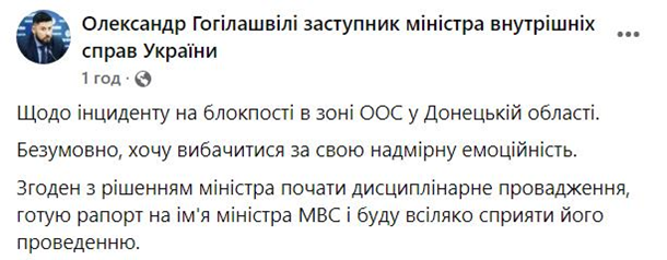 "Щодо інциденту на блокпості в зоні ООС у Донецькій області. Безумовно, хочу вибачитись за свою зайву емоційність", - написав Гогілашвілі.