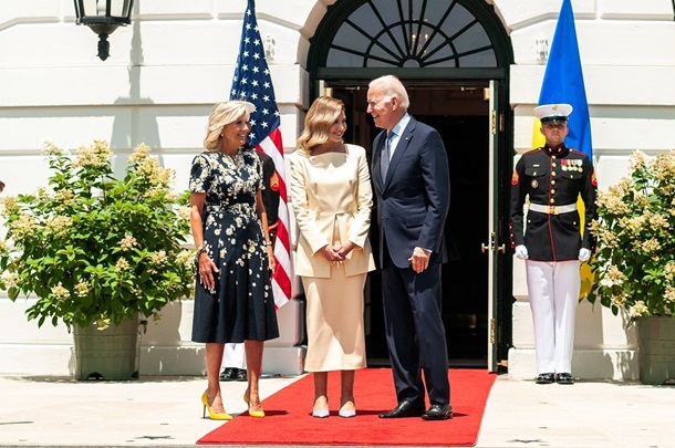 Перша леді України Олена Зеленська вирушила до США, де зустрілася з місцевим президентом Джо Байденом та його дружиною Джілл Байден. Дружини президентів взули туфлі, що утворили разом кольори українського прапора. Фото опубліковані в Instagram.