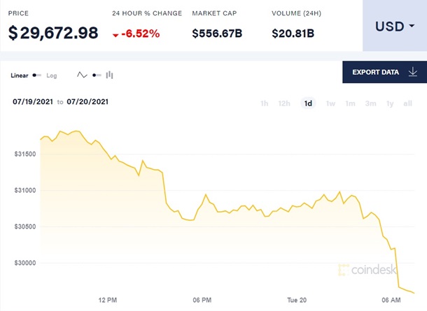 Найпопулярніша криптовалюта біткоїн істотно втратила в ціні, опустившись нижче від психологічної позначки в 30 тисяч доларів. Про це повідомляєCoinDeskу вівторок, 20 липня.