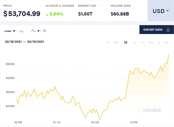 Найпопулярніша криптовалюта біткоїн завершує робочий тиждень черговим історичним рекордом. У п'ятницю, 19 лютого, вперше був подоланий рубіж у 53 тисячі доларів. Про це свідчать дані CoinDesk.