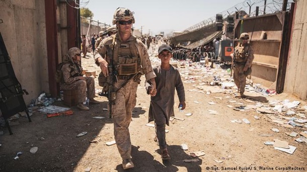 Ситуація в Афганістані не змінила намірів США - американський президент Джо Байден підтвердив, що 31 серпня Афганістан залишить останній американський солдат. На фото: американський морський піхотинець в аеропорту Кабула веде дитину до батьків. Поки американці в аеропорту, люди, що опинились там, почуваються відносно захищеними.
