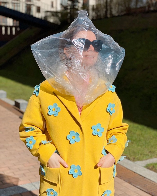 На ней ярко-желтое пальто с голубыми цветами, на лице солнцезащитные очки, а на голове – обычный полиэтиленовый пакет вместо медицинской маски.