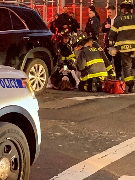 Just now at Delancey and Norfolk in the Lower East Side an accident ran over a pedestrian trapping them under an SUV. Onlookers just lifted the SUV, dragging the victim out.