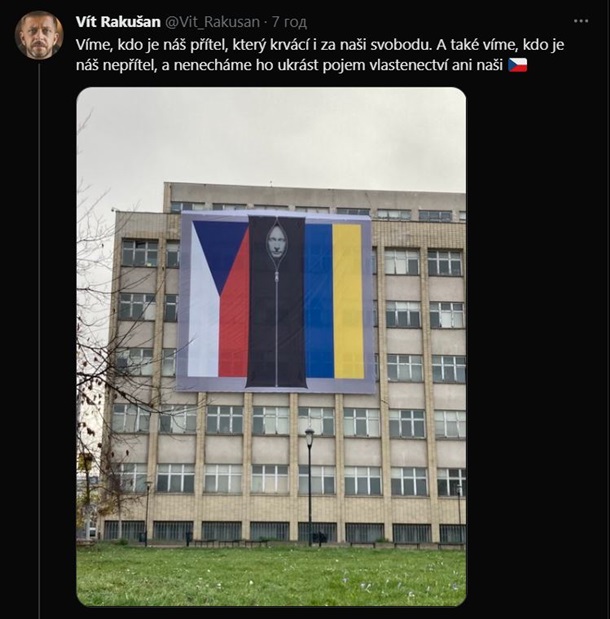 Міністерство внутрішніх справ Чехії у п'ятницю, 28 жовтня, розмістило на своїй будівлі банер, на якому на тлі чеського й українського прапорів зображено мішок для трупів, з якого видно голову президента РФ Володимира Путіна. Відповідне фото опублікував голова чеського МВС Віт Ракушан у Twitter.