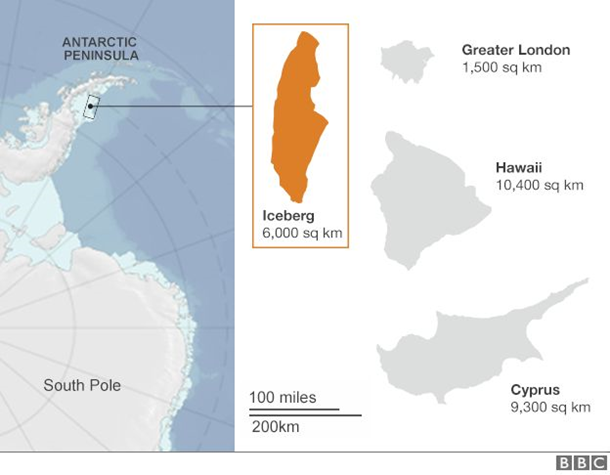А-68 откололся от восточной части Антарктического полуострова. Фото: BBC