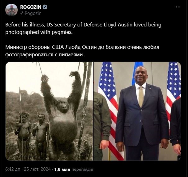 Бывший гендиректор российского Роскосмоса, а ныне так называемый "сенатор" РФ от оккупированной части Запорожской области Дмитрий Рогозин сравнил главу Пентагона Ллойда Остина с гориллой. Соответствующий пост он опубликовал в соцсети Х.