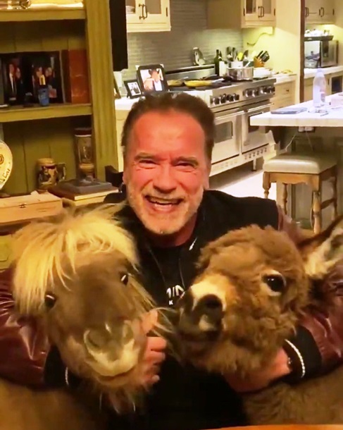 72-летний Шварценеггер не унывает и не скучает, поскольку этого ему не дают его домашние животные: собака Вишенка, пони Виски и мини-ослица Лулу.