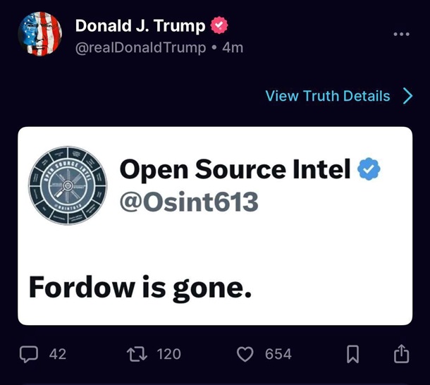 Также он опубликовал сообщение, в котором заявил, что главный ядерный объект Ирана – Фордо - больше не существует.