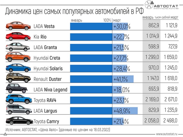 Подорожчання пов'язують із дефіцитом напівпровідників, логістичними проблемами, різким коливанням курсу рубля та нестачею автомобілів у дилерів на тлі санкцій через розв'язану Росією війну в Україні.