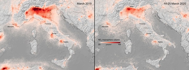 Снимки показывают существенное уменьшение концентрации оксида азота над рядом крупных европейских городов по сравнению с мартом 2019 года - особенно над Парижем, Миланом и Мадридом. Эти изменения совпали с внедрением карантина.