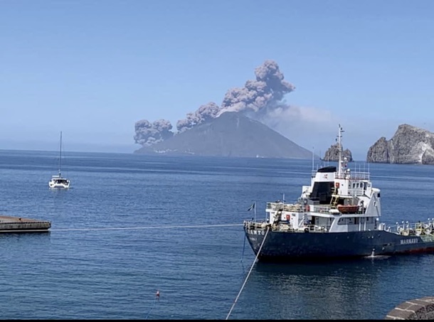На знімках видно величезний стовп чорного диму над вулканом Стромболі на однойменному острові в Тірренському морі біля Сицилії. Виверження супроводжував потужний викид попелу, піску та іншого вулканічного матеріалу. На західному схилі Стромболі з кратера почала активно виливатися магма. Там на висоті близько 600 метрів є заглиблення Вогняний потік, з якого магма спадає в море.