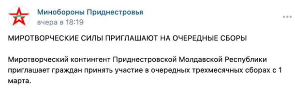 "Миротворческий контингент Приднестровской Молдавской Республики продолжает прием заявок на участие в очередных трехмесячных сборах с 1 марта", - говорится в сообщении Минобороны.