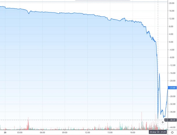 В первой половине дня 20 апреля котировки нефти WTI "плавно" опускались с 18 до 10 долларов за баррель. После этого цены покатились "в пропасть": в течение двух часов котировки достигли абсолютного минимума 10 центов за баррель. К вечеру котировки обрушились почти в 200 раз.