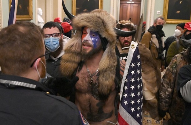 Ставший знаменитым мужчина в шлеме с рогами (32-летний Джейк Анджелли Чансли), шедший в первых рядах атакующих и потом занявших кресло спикера Сената, был известен на форумах сторонников теории как QAnon Shaman.