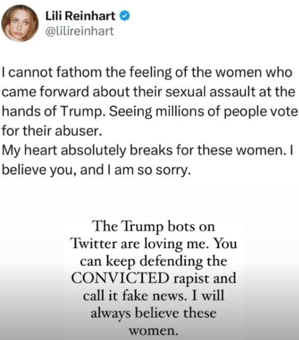Другие знаменитости. как актриса из сериала Ривердейл. выразили поддержку женщинам, которые в свое время обвинили Трампа в сексуальных домогательствах, в частности, журналистке Джин Кэрролл. Она заявила: "Видеть, как миллионы людей голосуют за их обидчика. Мое сердце абсолютно разрывается за этих женщин".