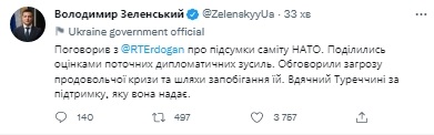 "Поділилися оцінками поточних дипломатичних зусиль. Обговорили загрозу продовольчої кризи і шляхи її запобігання. Я вдячний Туреччині за підтримку", – наголосив Зеленський.