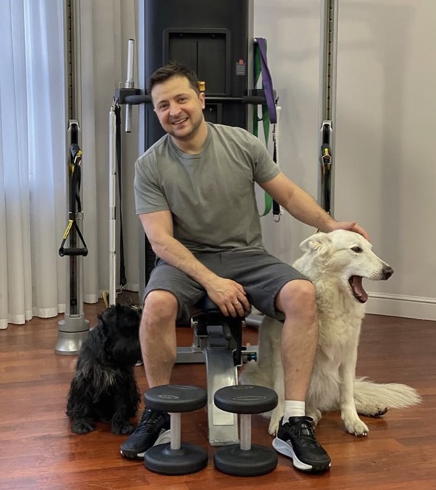 На фотографії президент України позує біля тренажера разом із двома собаками.