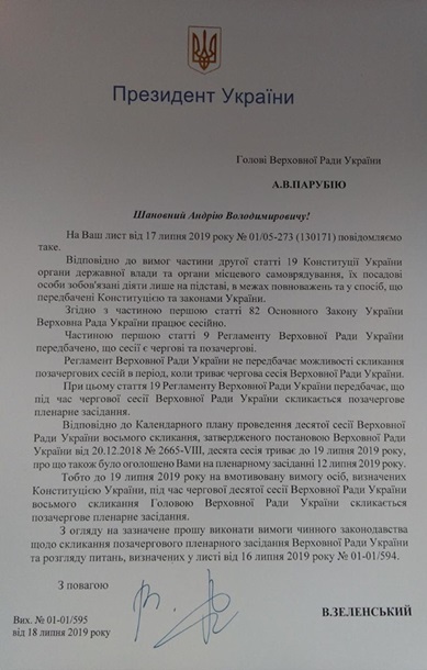 "Согласно Календарного плана проведения десятой сессии Верховной Рады Украины восьмого созыва.. десятая сессия длится до 19 июля 2019 года, что было также объявлено вами на пленарном заседании 12 июля 2019 года. Учитывая указанное, прошу выполнить требования действующего законодательства относительно созыва внеочередного пленарного заседания Верховной Рады Украины и рассмотрения вопросов, определенных в письме от 16 июля 2019 года", - говорится в письме.