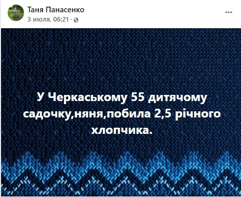 У Черкасах у дитячому садку №55 няня побила дитину, якій 2,5 року. Відзначається, що у малюка після цього з'явилися синці. Про подію ще 3 липня повідомила місцева мешканка Тетяна Панасенко у Facebook.