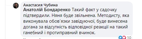 "Такий факт у садочку підтвердили. Няню буде звільнено. Методисту, яка виконувала обов'язки завідуючої, буде догана через відсутність відповідної реакції на такий ганебний та протиправний вчинок", - написала в коментарях Чубіна.