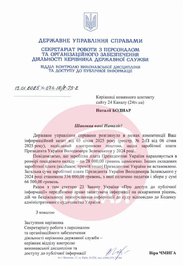 "Общая сумма заработной платы Президента Украины Владимира Зеленского в 2024 году составила 336 тысяч гривен, с которой уплачены налоги и сборы в сумме 66 500 гривен", - говорится в документе.