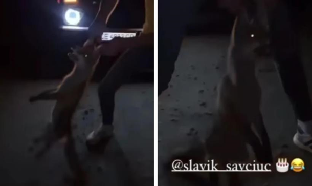 На кадрах видно, як тварину розгойдують, тримаючи за вуха, і підносять до фари заведеного авто. Також можна почути, як лисеня видає жалібні звуки.