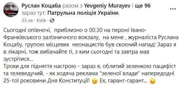 "Сьогодні опівночі, приблизно, о 00:30 на пероні Івано-Франківського залізничного вокзалу, на мене, журналіста Руслана Коцаба, групою місцевих неонацистів було скоєно напад! Зараз я в лікарні, тому вибачте ті, з ким сьогодні і завтра мав зустрітися...", - повідомив потерпілий.