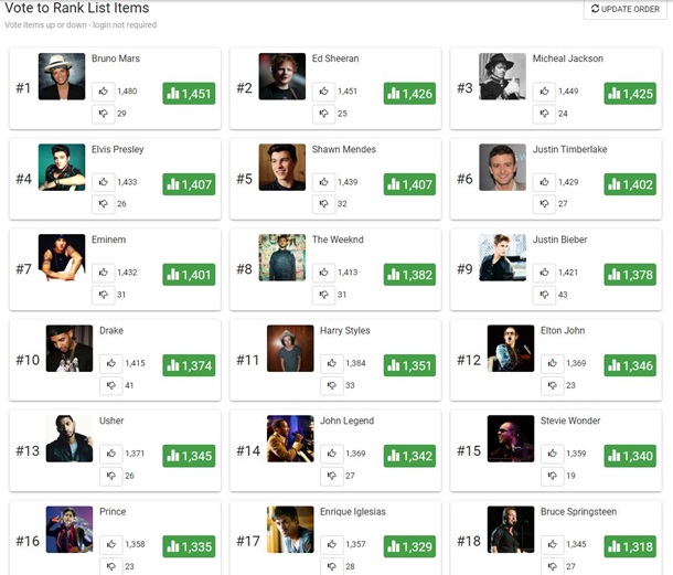 Користувачі порталу List Challenges обрали найкращого співака усіх часів. Ним виявився американський музикант та автор композицій Бруно Марс, який набрав 1448 голосів.