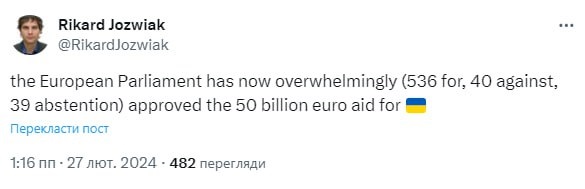 Європарламент схвалив 50 млрд євро допомоги Україні. Про це у вівторок, 27 лютого, повідомив редактор Радіо Свобода в Європі Рікард Йозвяк.