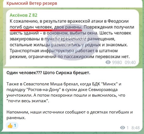 Так званий "голова Криму" Сергій Аксьонов повідомляє, що під час нічної атаки ЗСУ на Феодосію одна людина загинула і двох поранено, але проукраїнські кримські пабліки не погоджуються з цими даними.