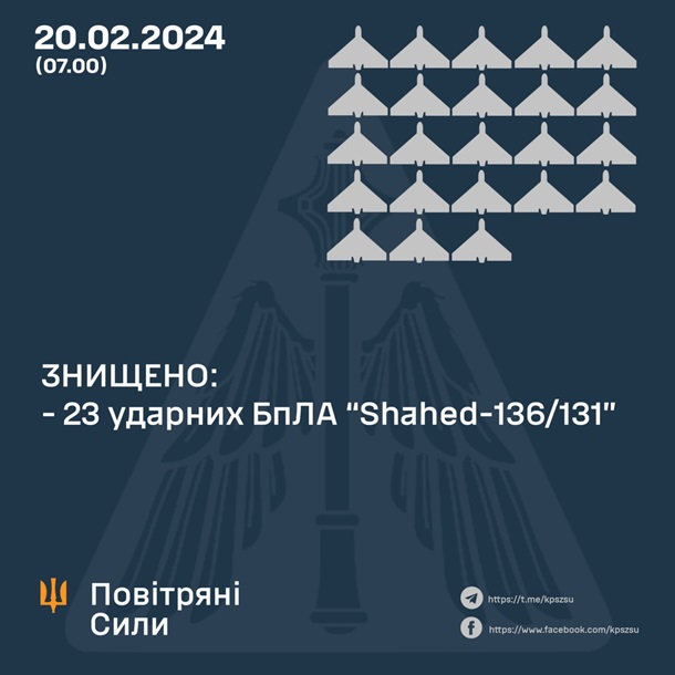 Українська ППО знищила вночі всі 23 російські БПЛА, які ворог випустив по території України. Про це вранці у вівторок, 20 лютого, повідомила пресслужба Повітряних Сил ЗСУ.