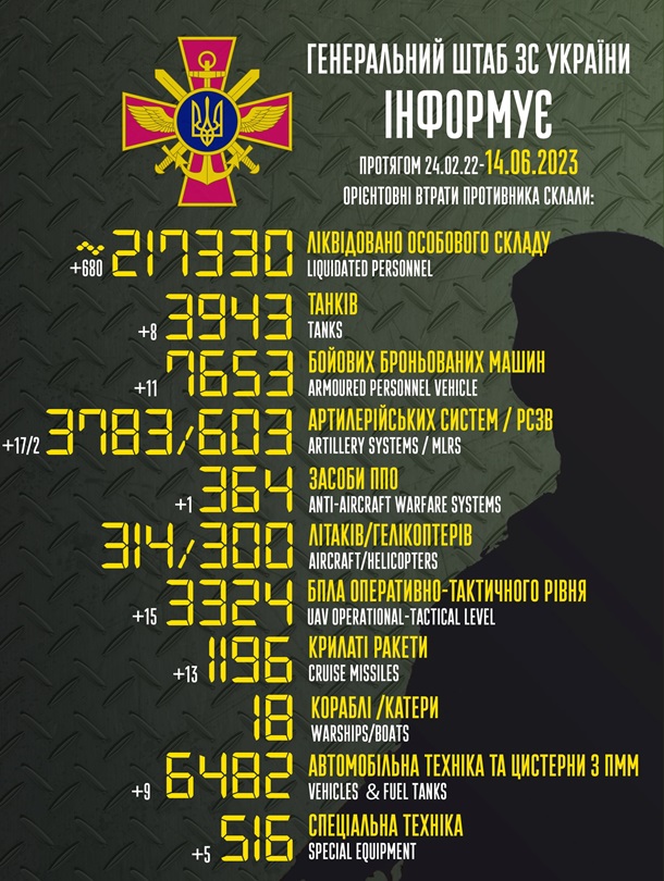 З 24 лютого 2022 року по 14 червня 2023 року загальні бойові втрати особового складу російських військ на території України орієнтовно склали 217 330 осіб (+680 за добу). Про це повідомив Генеральний штаб ЗСУ.