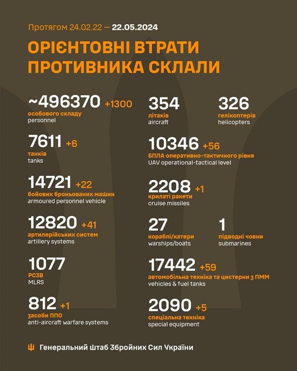 ЗСУ за добу знищили 1300 російських окупантів. Загальні втрати армії РФ з початку війни становлять 496 370 осіб. Про це 22 травня повідомив Генштаб.
