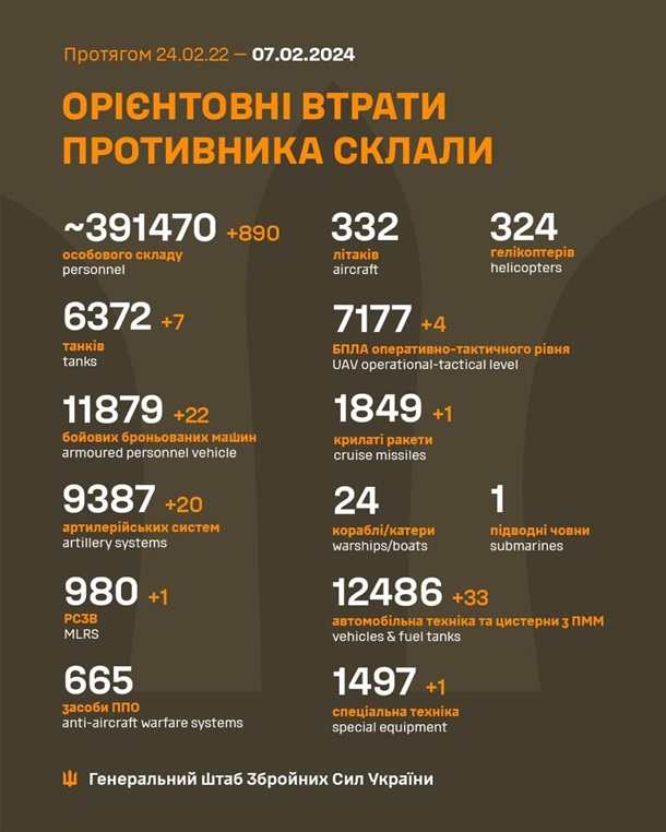 Втрати Росії в України за минулу добу зросли майже на 900 окупантів і тепер становлять понад 391 тисячу осіб. Про це йдеться в повідомленні Генерального штабу ЗСУ в Telegram у середу, 7 лютого.