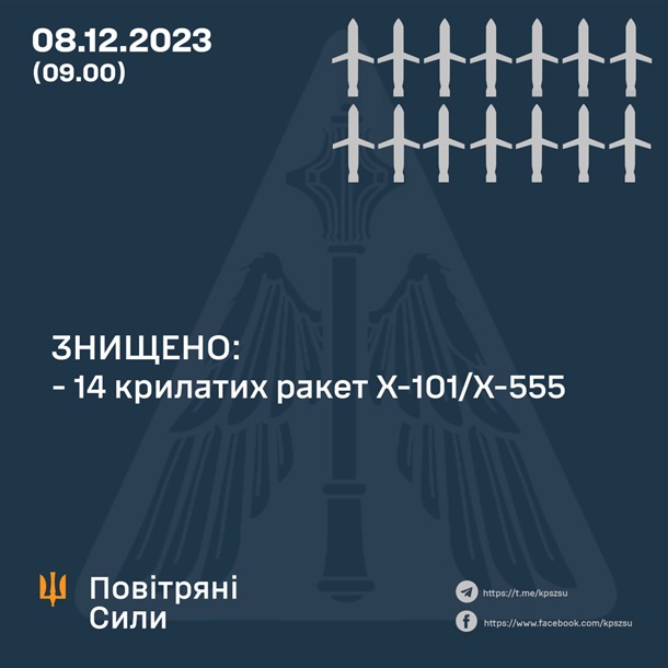 Росіяни запустили вранці 8 грудня по Україні 19 крилатих ракет Х-101 і Х-555. Протиповітряній обороні вдалося знищити 14 ракет. Про це повідомив речник командування Повітряних сил ЗСУ Юрій Ігнат в ефірі телемарафону Єдині новини.