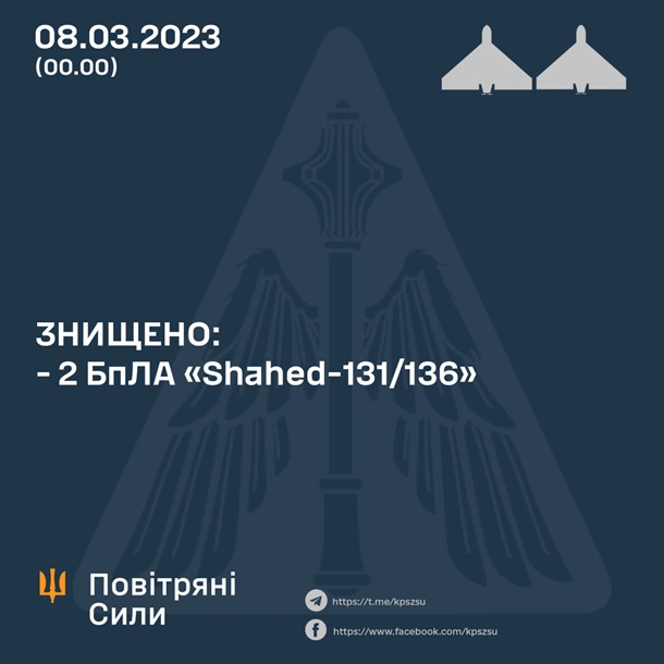 "Опівночі 8 березня 2023 року протиповітряною обороною знищено два іранські дрони-камікадзе Shahed-131/136, якими окупанти атакували Україну з північного напрямку", - йдеться в повідомленні.