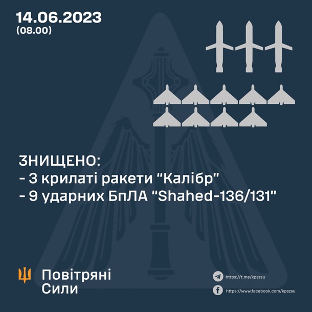 У ніч з 13 на 14 червня російські війська завдали ракетного удару по військових та інфраструктурних об’єктах України крилатими ракетами повітряного та морського базування, а також ударними дронами-камікадзе. Українські захисники збили 12 ворожих цілей. Про це повідомляє командування Повітряних Сил ЗСУ.