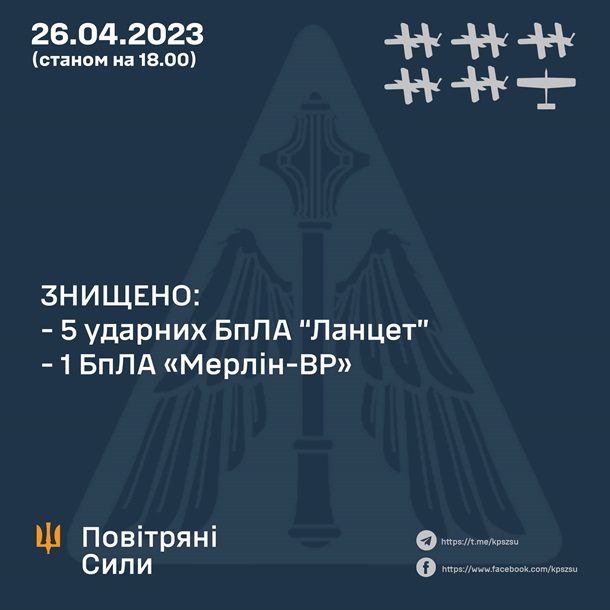 Повітряні сили України в середу, 26 квітня, знищили шість ворожих безпілотників на Херсонщині. Про це повідомили у Командуванні Повітряних Сил ЗСУ.