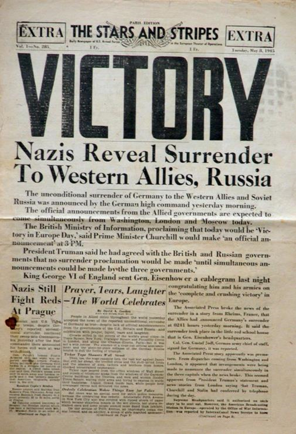 - 1945 - У передмісті Берліна Карлсхорсті підписаний акт про беззастережну капітуляцію Німеччини у Другій світовій війні. У США і в багатьох країнах Західної Європи відзначають День Перемоги.