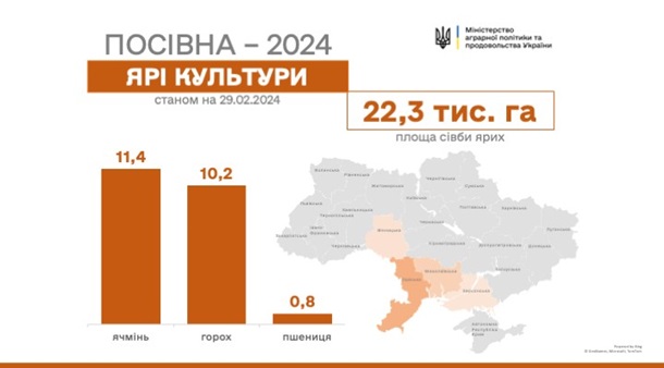 Станом на кінець лютого вже засіяно 22,3 тис. га: 0,8 тис га пшениці, 11,4 тис. га ячменю та 10,2 га гороху.