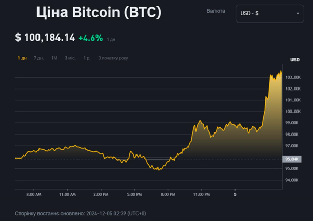Біткоїн (Bitcoin) вперше перевищив позначку 100 000 доларів, встановивши свій новий історичний максимум з часу запуску криптовалюти понад десять років тому. Про це пише Reuters в четвер, 5 грудня.