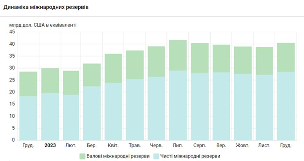 Міжнародні резерви України за 2023 рік зросли на 42% до 40,508 млрд доларів. Про це повідомляє НБУ.