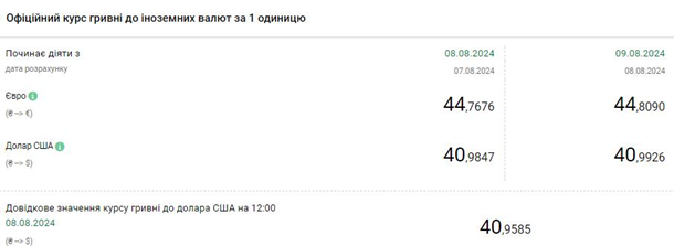Станом на 8 серпня офіційно встановлений регулятором курс становив 40,98 грн/дол та 44,76 грн/євро відповідно.