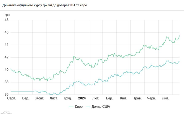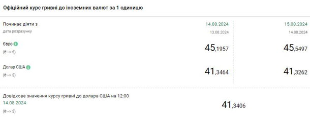 Станом на 14 серпня офіційно встановлений регулятором курс становив 41,34 грн/дол та 45,19 грн/євро відповідно.
