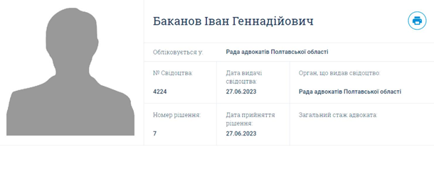 У профілі Баканова на сайті асоціації вказано, що свідоцтво адвоката видано 27 червня 2023 року. Номер свідоцтва - 4224. Орган, який його видав - Полтавська Рада адвокатів.
