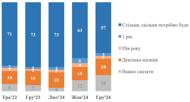 З жовтня до грудня 2024 року цей показник знову дещо зменшився, досягнувши 57%. А частка тих, хто говорить про готовність терпіти лише кілька місяців або пів року, залишилася майже незмінною - 21% у грудні проти 18% у жовтні, тобто все ще в межах початкових 18-21%.