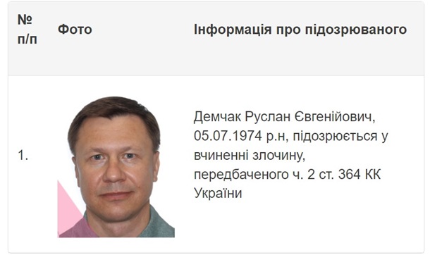 "Національне антикорупційне бюро України розшукує підозрюваного у кримінальному провадженні № 52024000000000164 від 08.04.2024, а саме Демчака Руслана Євгенійовича за підозрою у вчиненні злочину, передбаченого ч. 2 ст. 364 ККУ", - йдеться в повідомленні.