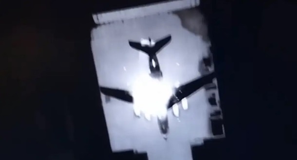 Результат удару по літаку Іл-76, зафіксований камерою дрона. Фото: The War Zone/ГУР