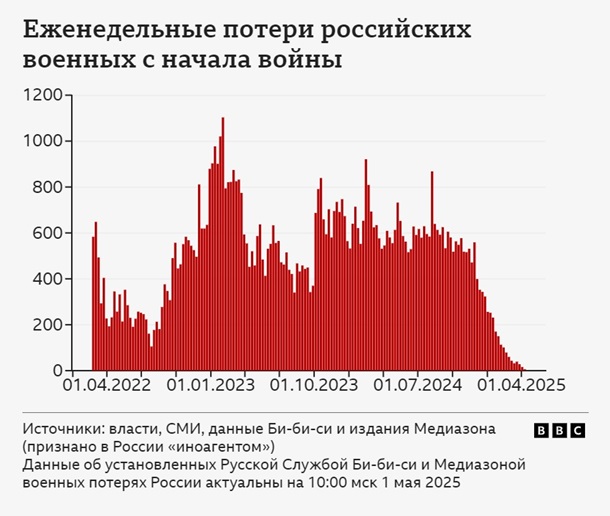 Але минулого року ситуація була іншою. У 2024-му періодів зменшення втрат на фронті не було. Найбільші втрати РФ фіксували з вересня до листопада.