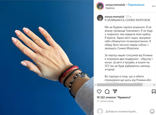 "За період наших стосунків від Романа я отримала два подарунки - каблучку та кольє. Ці речі я продам, а кошти на ЗСУ (як це відбуватиметься напишу згодом). Усі підозри в тому, що я нібито отримувала ще щось від Романа або членів його родини - квартири, машини, нерухомість, будь-що, - я відкидаю, і готова доводити це в суді і як завгодно", - додала Морозюк.